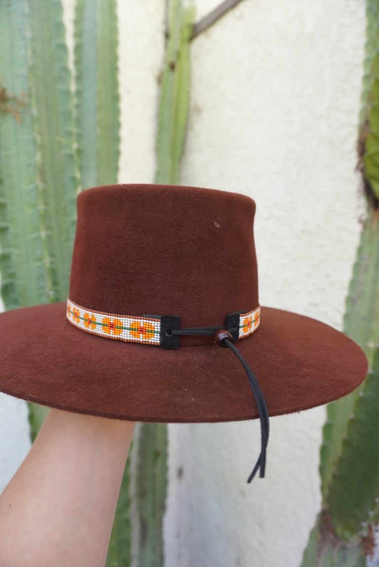 Hand beaded hatband using glass beads. 3/4 inch thick. Hatbands can fit any hat size with a suede closure that secures with a big wooden bead.