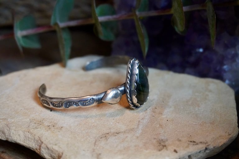 One of a kind, hand fabricated, sterling cuff with ethically sourced labradorite.