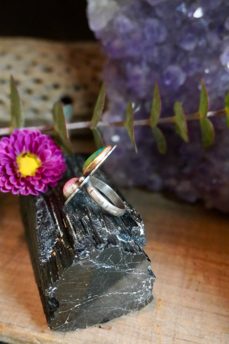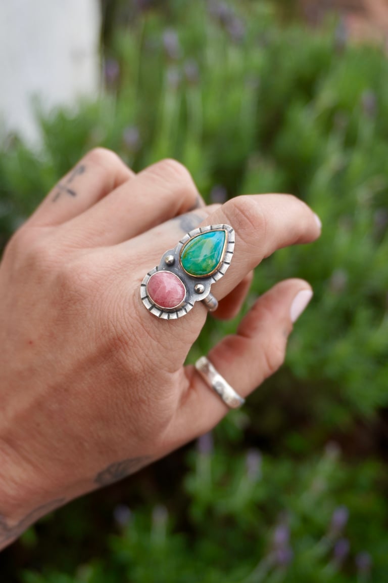 One of a kind, hand fabricated, sterling silver ring with 14k gold fill bezel. Ethically sourced rhodochrosite and chrysocolla stone.