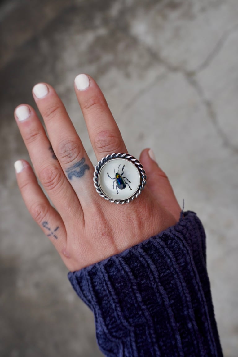 One of a kind, hand fabricated, sterling silver ring with scarab in resin cabochon.