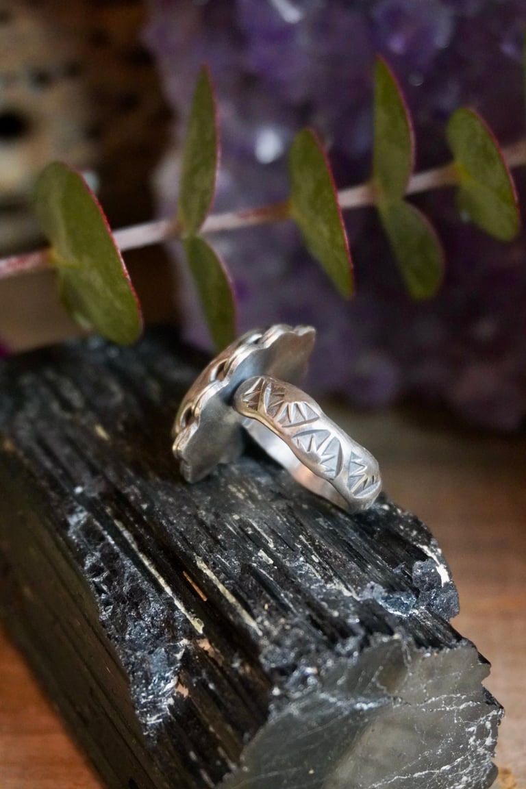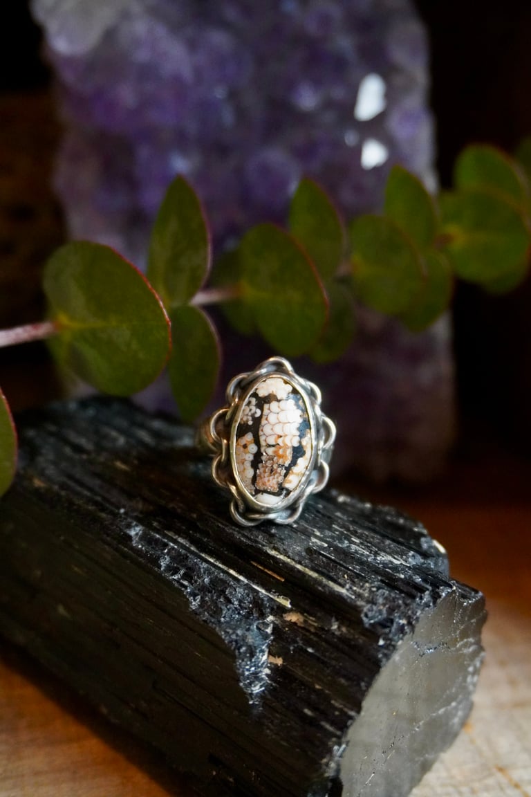One of a kind, hand fabricated, sterling silver ring with ethically sourced snakeskin agate.