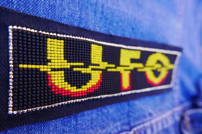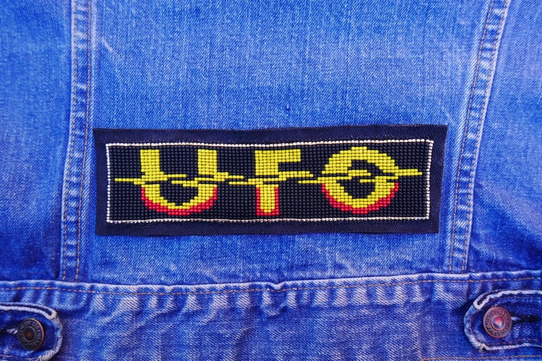 Hand beaded UFO patch using size 11/0 Japanese glass seed beads in matte black, yellow, matte red, and gold border.